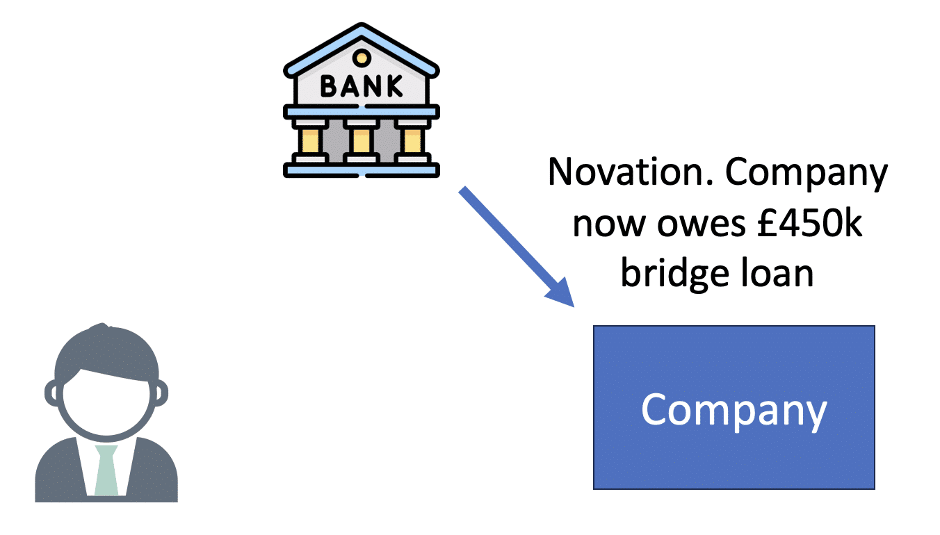 Immediately afterwards – this is all happening on the same day – the company uses the £450k to “repay” the bridge loan. In theory: