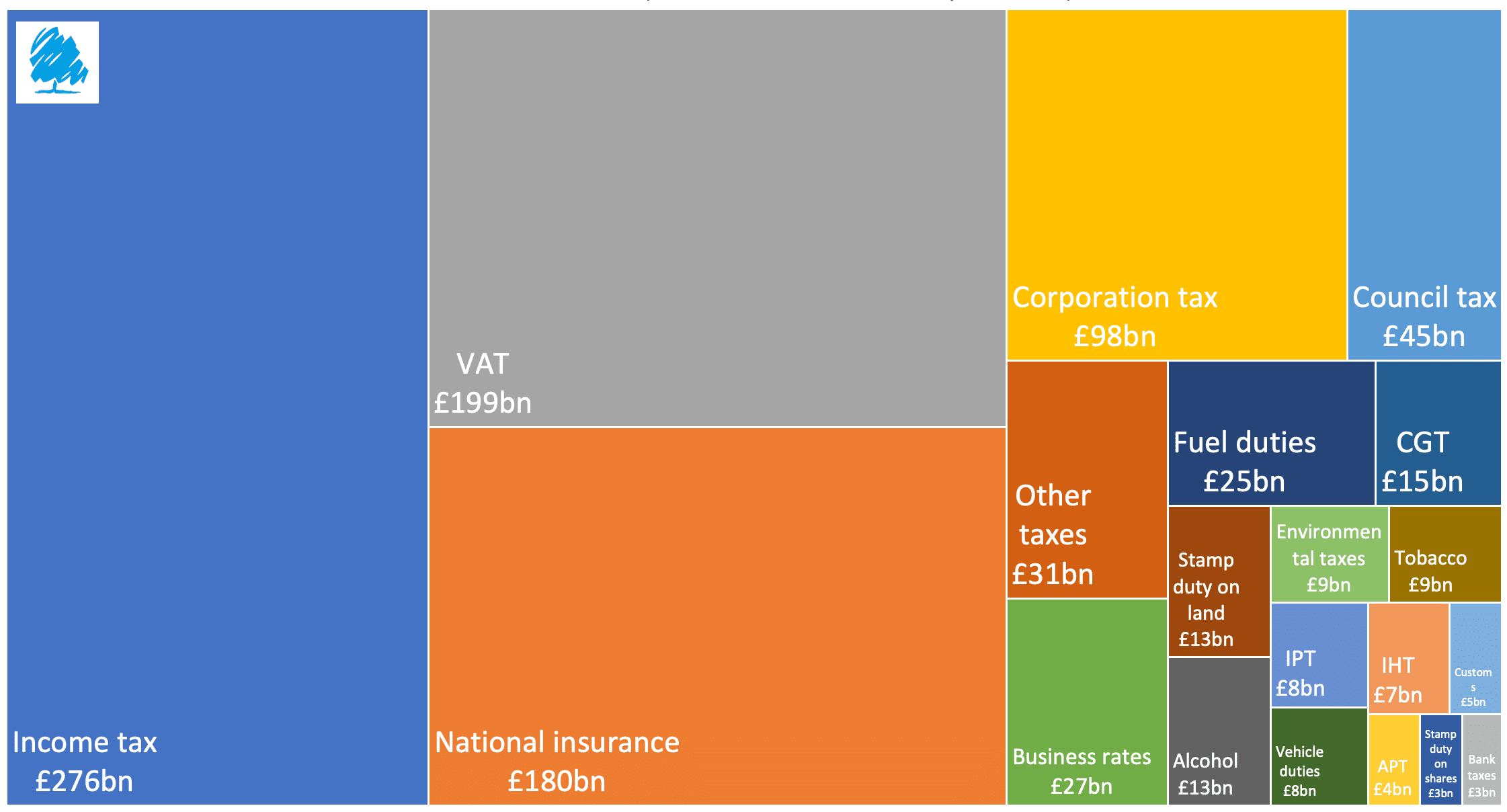 To provide some context, this chart shows current tax receipts for 2023/24. We’ve overlaid a Conservative Party logo equal to the size of the Conservatives’ proposed tax cuts for 2024/25 (for ease of reference, the logo is in the top left of the chart, but the cuts are not to income tax).