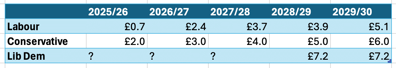 We believe the Labour and Conservative figures are ambitious but may be achievable. We do not believe the Lib Dem figures are achievable in the early years, and the suggestion the £7.2bn figure is year-on-year may be a mistake.