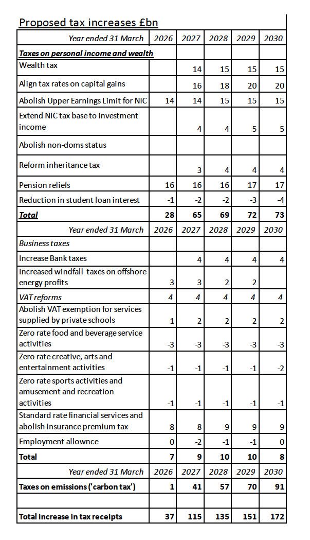 The Green Party has published its manifesto. The Green Party propose raising taxes by £115bn in 2026/27 and £172bn in 2029/30 – about 4.5% of GDP. There is very little detail presented and the proposals are impossible to assess in any depth. It’s a huge missed opportunity to advocate for radical tax proposals, and move them into the mainstream.