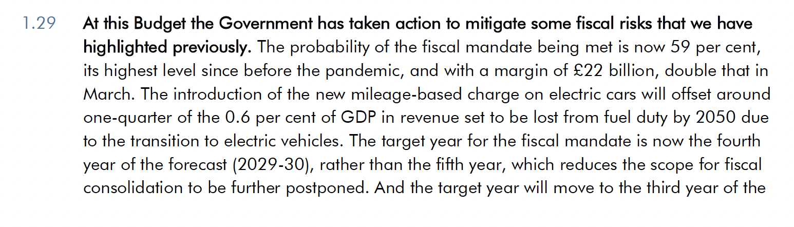 This is in part because it could be: Ms Reeves could meet the OBR projections, with £22bn headroom, and back-load most of the tax measures. But it’s also a necessity – the ways to raise money fast all involve increasing existing taxes – but that’s been ruled out. Almost all the tax measures in the Budget, by contrast, take time to kick in. Thresholds were already frozen to 27/28, so new freezes don’t raise any money before 2029. The new EV duty and council tax surcharge take time to implement. Even income tax on property income needs systems/self assessment changes.