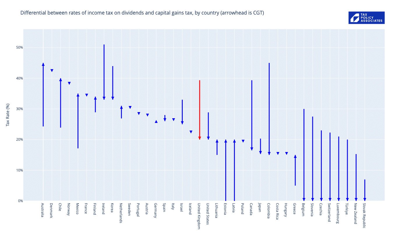 Third, a slight surprise: an increase in income tax on investment income – property, savings and dividends. The political attraction is obvious, and the Chancellor sensibly didn’t put up the top (additional) rate of dividend tax. That’s probably because UK dividend tax is already one of highest in the world. Look at the top of the arrow tails on this chart: