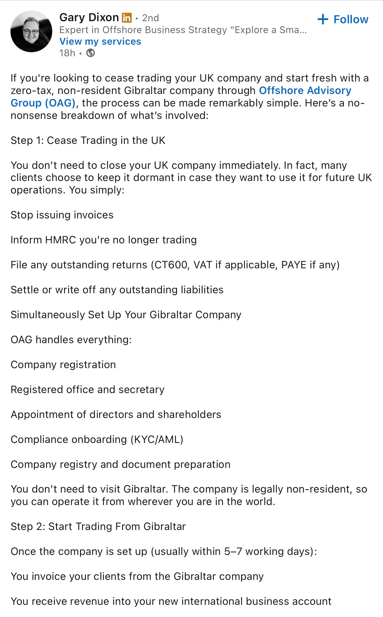 The Offshore Advisory Group LinkedIn account was renamed to Gibraltar Corporate Partners, with all the old content still there and still referring to the old name (the original post was deleted soon after we posted this article). The same people seem to be involved. They’ve responded in the comments below1, denying that they promote or advise on tax schemes (which is odd, given that their website and structure paper show that they do promote and advise and tax schemes ).