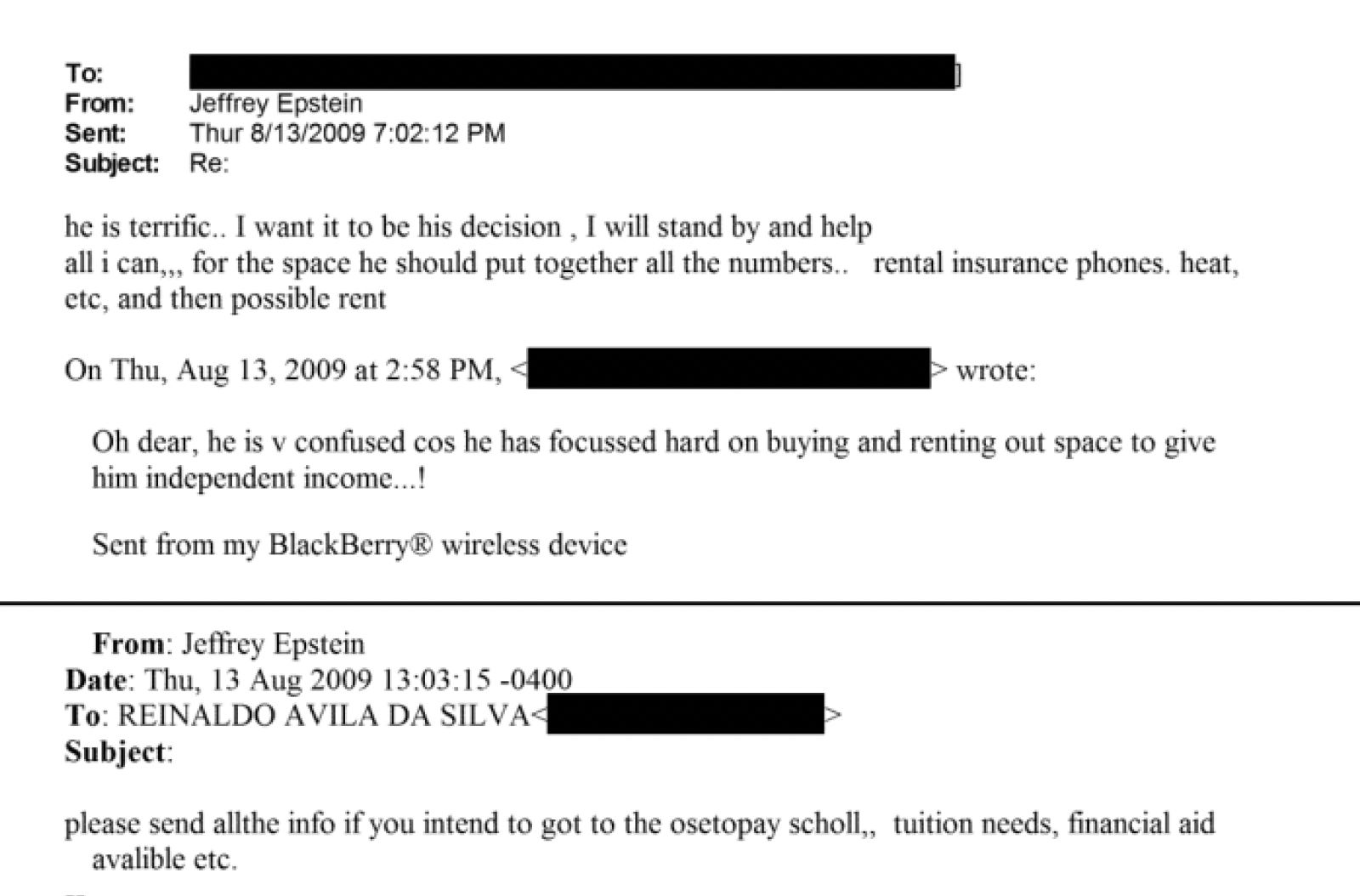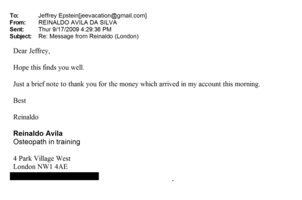 “Epstein told Reinaldo that he had an educational foundation which gave bursaries or scholarships and offered one for an osteopathy course. I saw this as kindness, nothing more. It was a great help to Reinaldo and I thanked him.