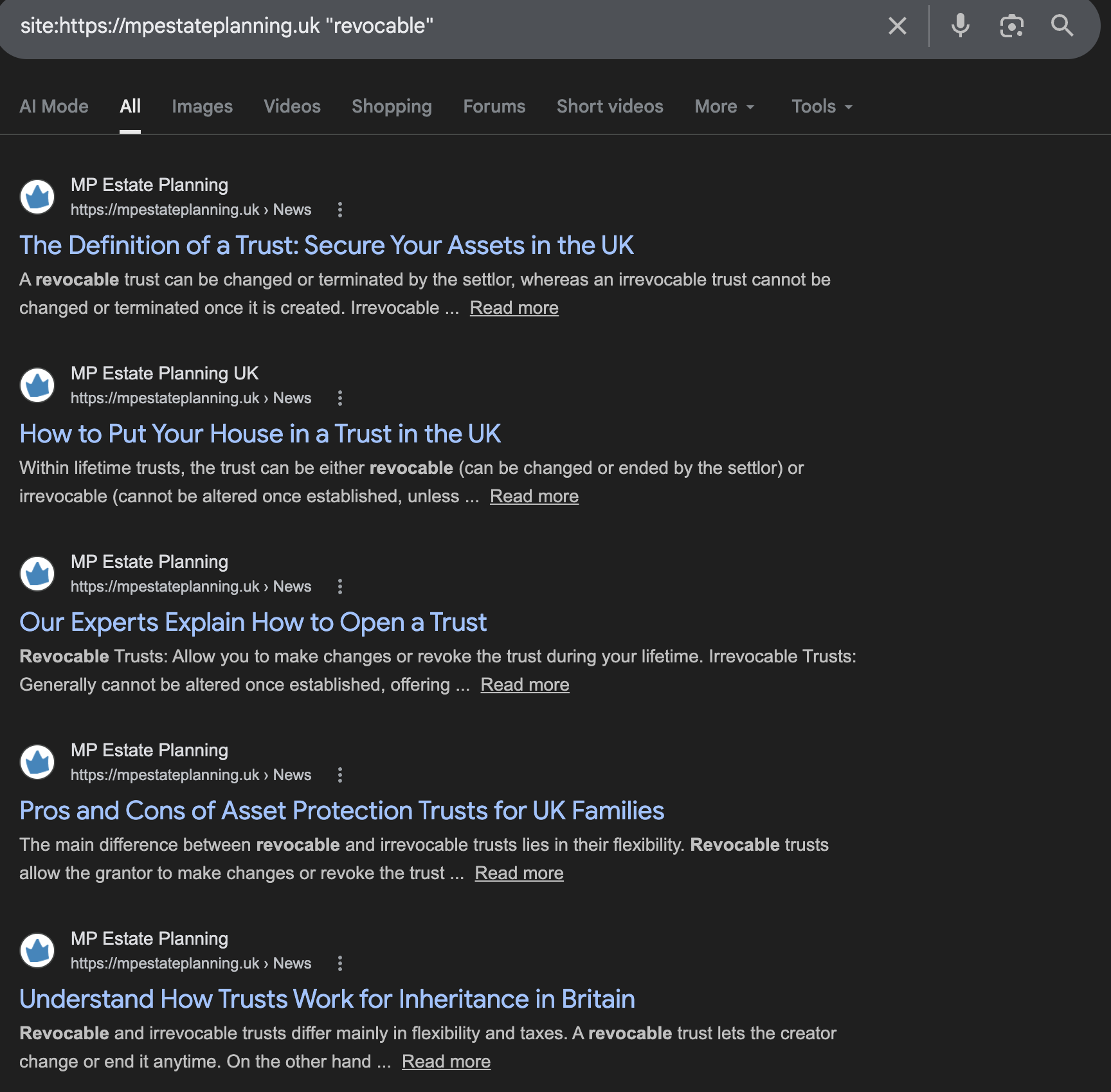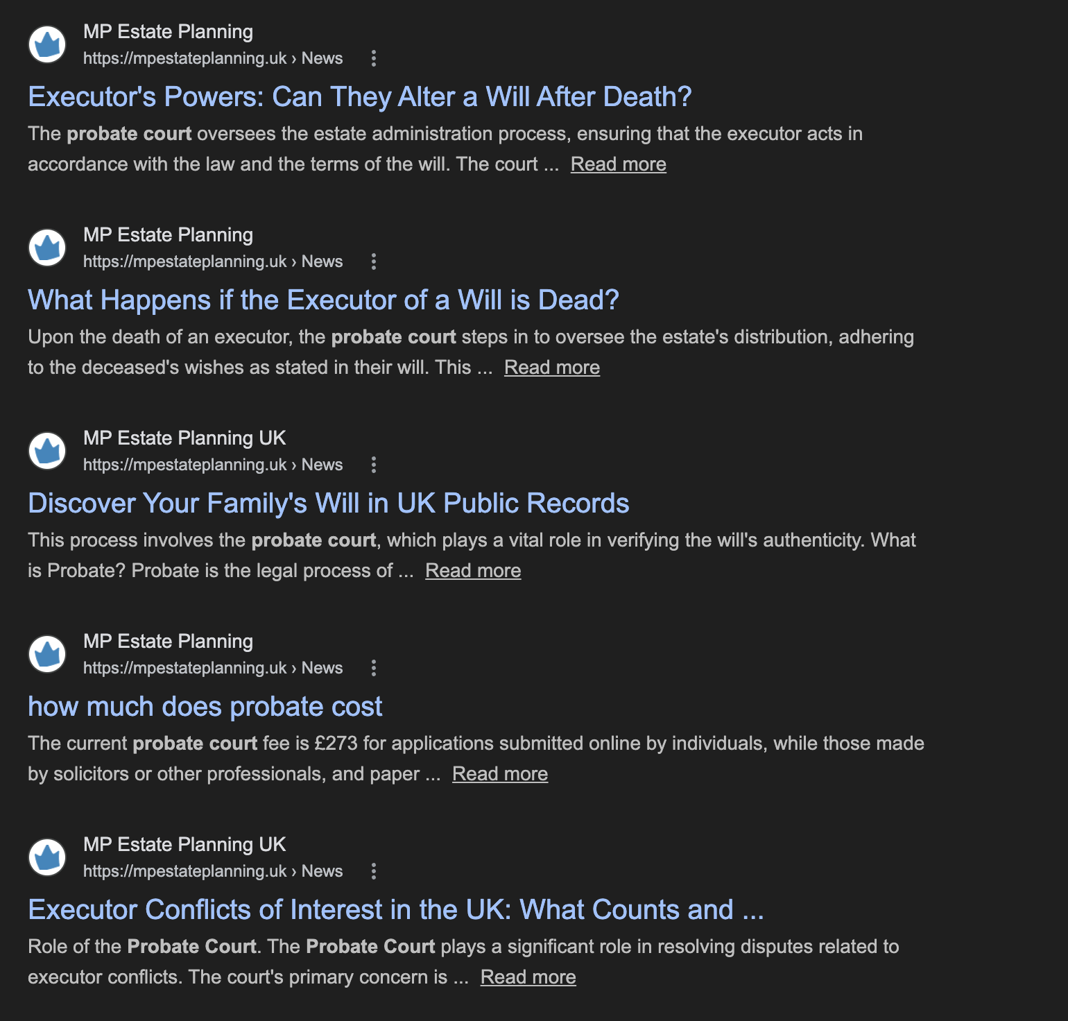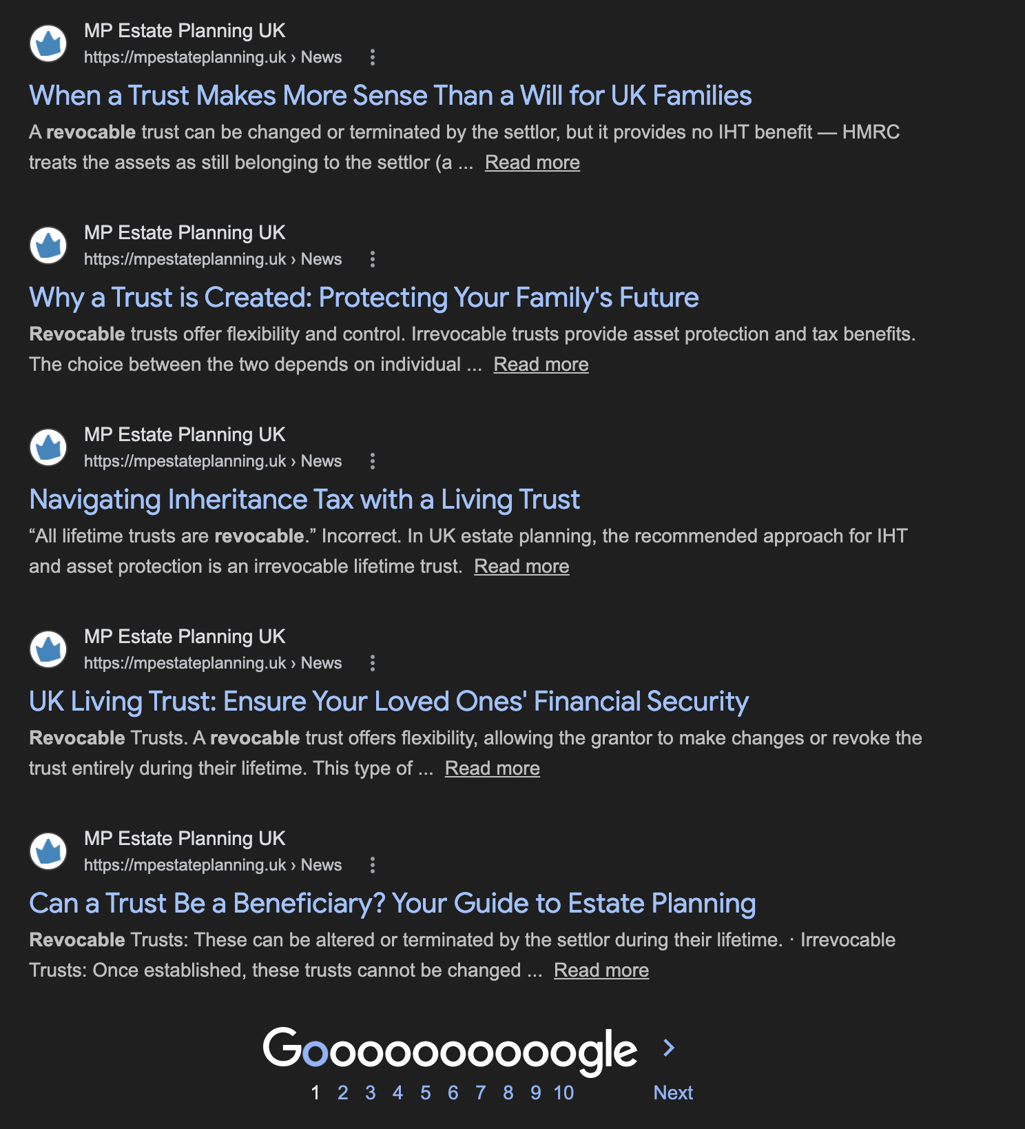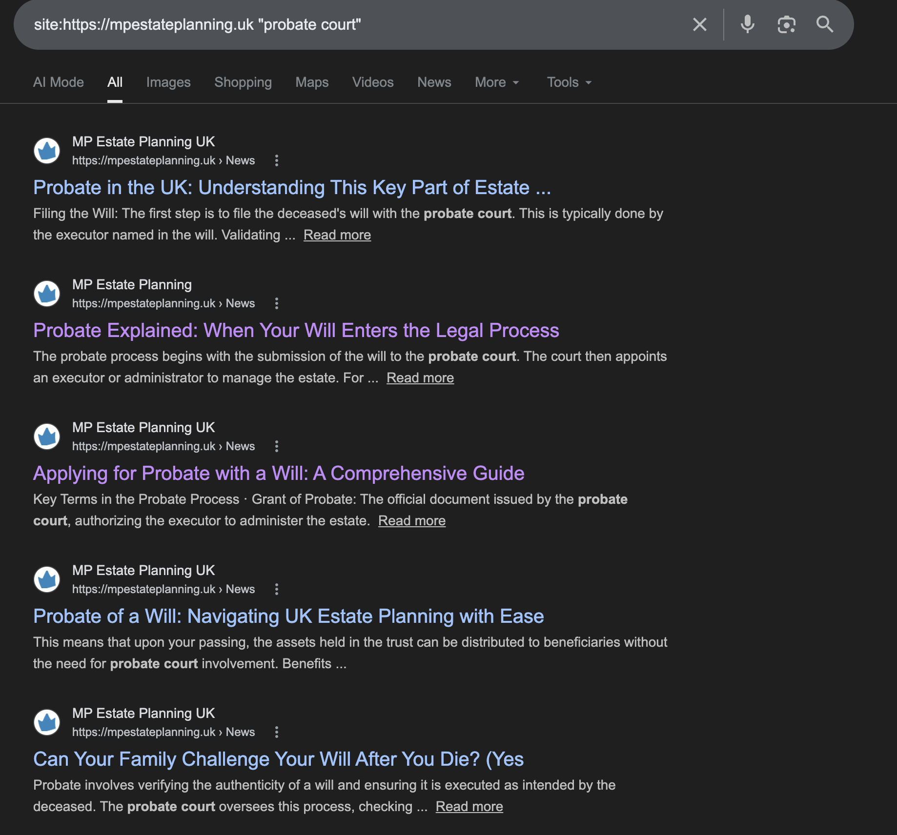 The website also has about 800 “doorway pages” – pages identical apart from the location, for example “estate planning in Stevenage” – you can see the complete list here. This is a well-known strategy to capture Google searches which is widely seen as abusive and misleading (“Based on our 18 years of experience providing inheritance tax advice in London…” or “Do You Need 24 Hour Emergency Estate Planning Services in Litton?“). The figures in the main text for the number of articles and words exclude these “doorway pages”. ↩︎