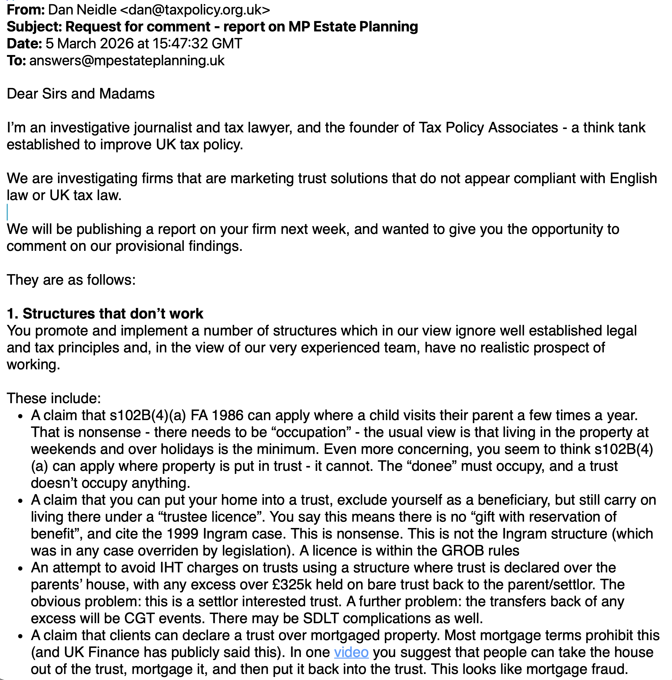 We were disappointed but not surprised to find trusts being missold – that’s been going on for years. What we found was much worse – a firm that operates on the edge of legality, and may step over the line. A series of misrepresentations as to what it is and what it does, and advice to clients that goes beyond “merely wrong” into shocking negligence. And when we asked MP Estate Planning for comment, they failed to provide any response to our technical criticisms, and provided answers to other points that we consider to have been intentionally misleading.