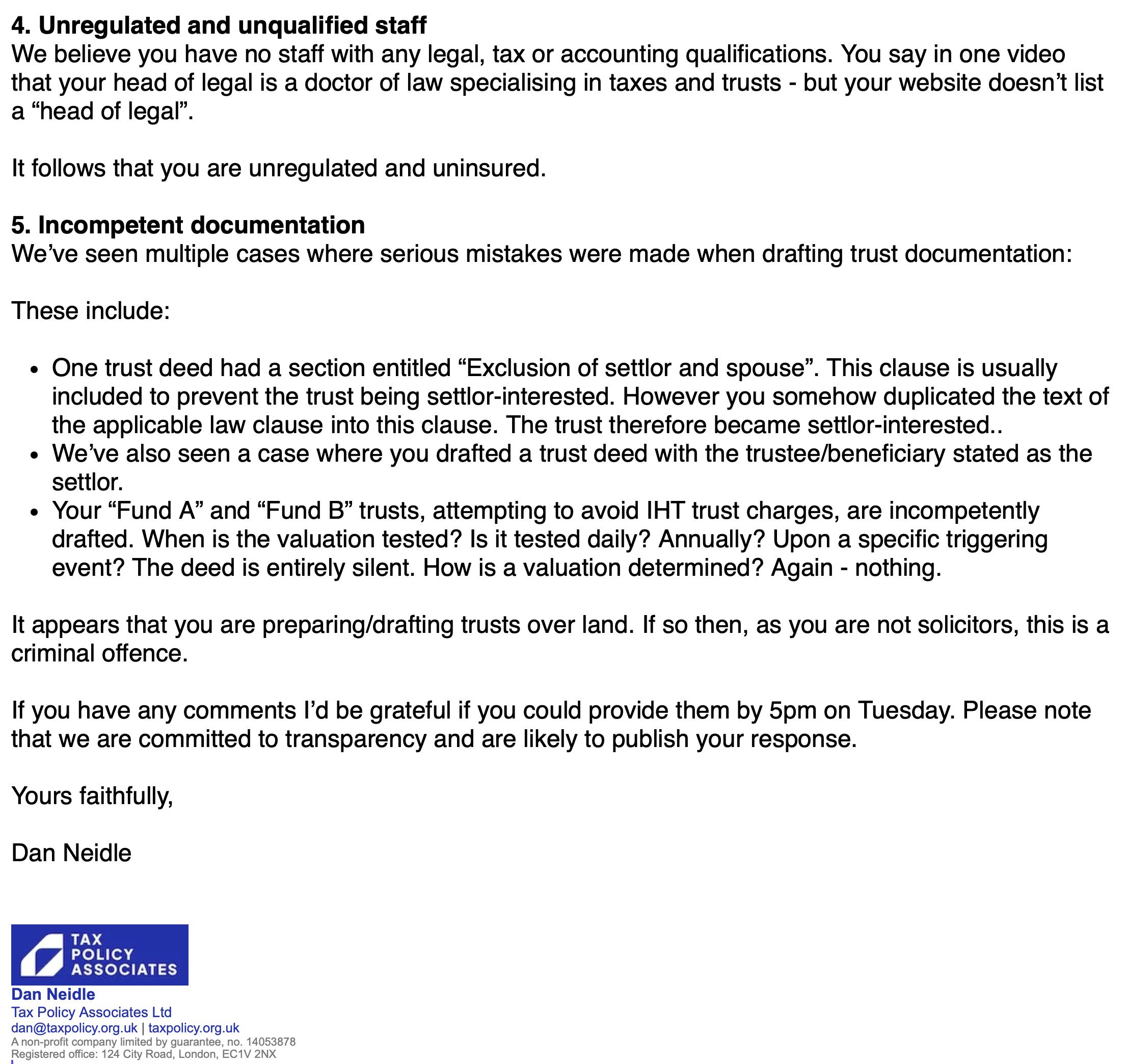 - One experienced adviser told us that the tax claims made by MP Estate Planning were so egregiously bad that they looked like fraud (although most of our team believe the firm is just unqualified and reckless).2