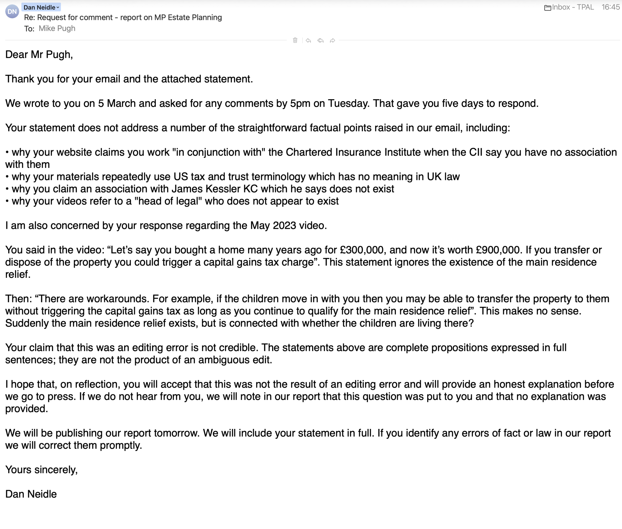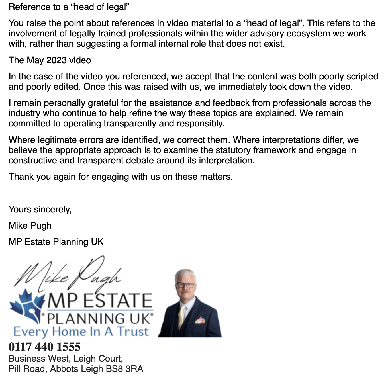 The response from MP Estate Planning and Mike Pugh