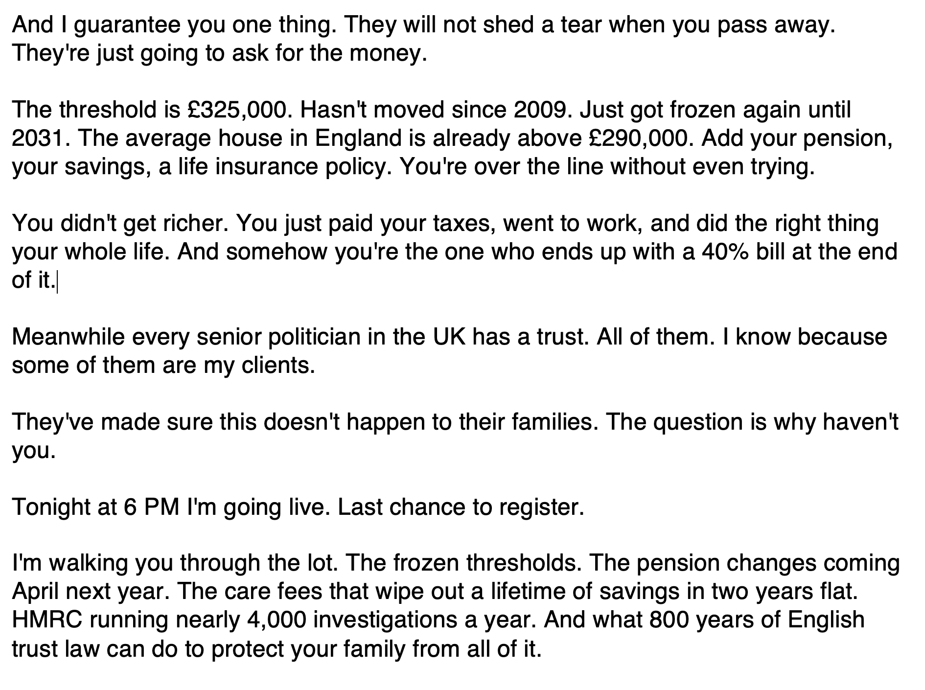 If you want to protect your home and see it safely get to your kids, click on the link in the description to watch my free master class on how to put assets into trust in the UK.”