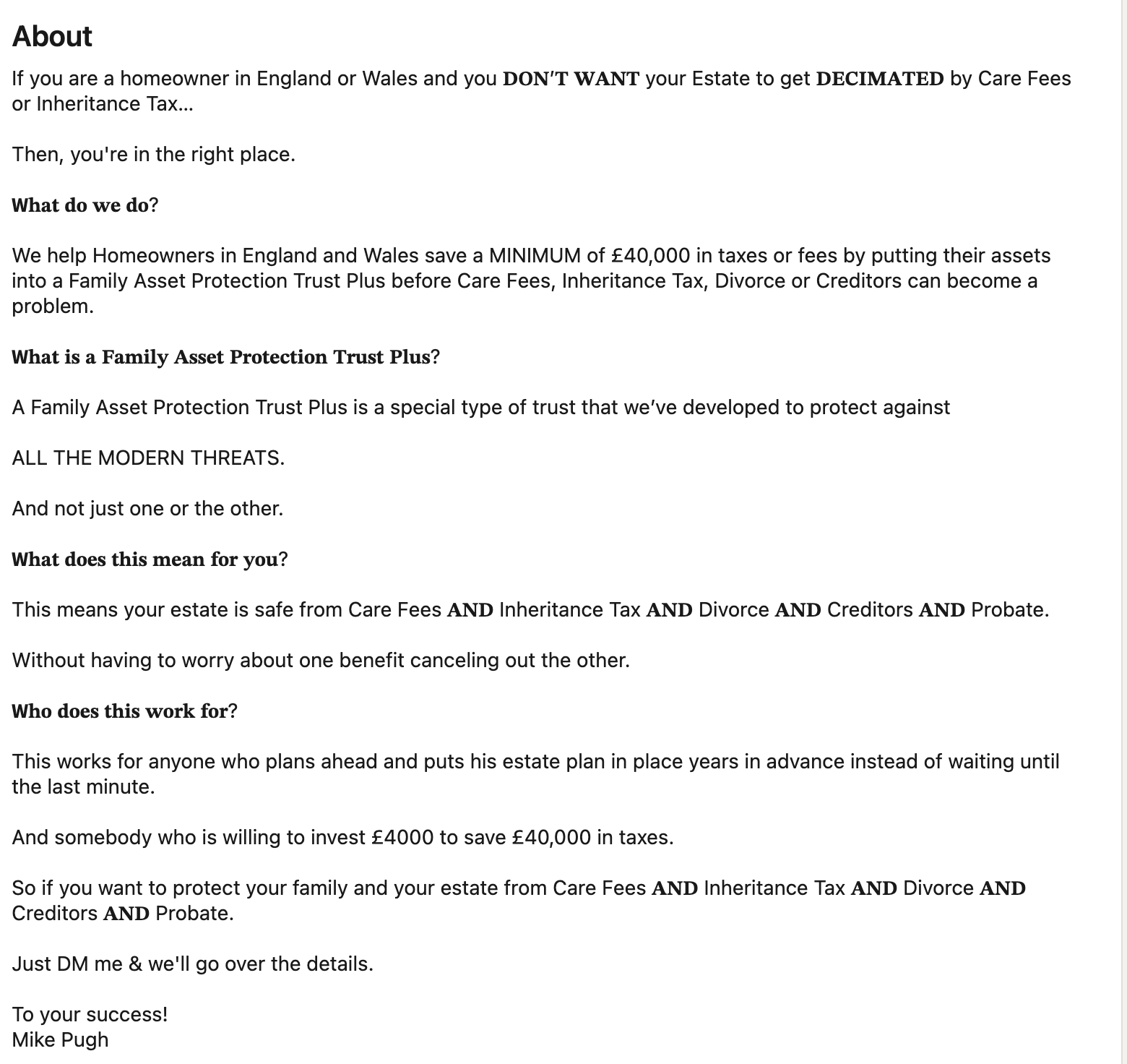 The lack of expertise doesn’t stop the firm marketing its business very aggressively. It has over 400 videos on social media pushing an alarmist message: “if you own anything, it can be taken from you”. Pugh says their mission is “quite literally to save the middle class from being completely wiped out in the UK”. The solution is simple: “every home in a trust” – and they’re pushing this proposition to elderly people with assets of as little as £150,000: