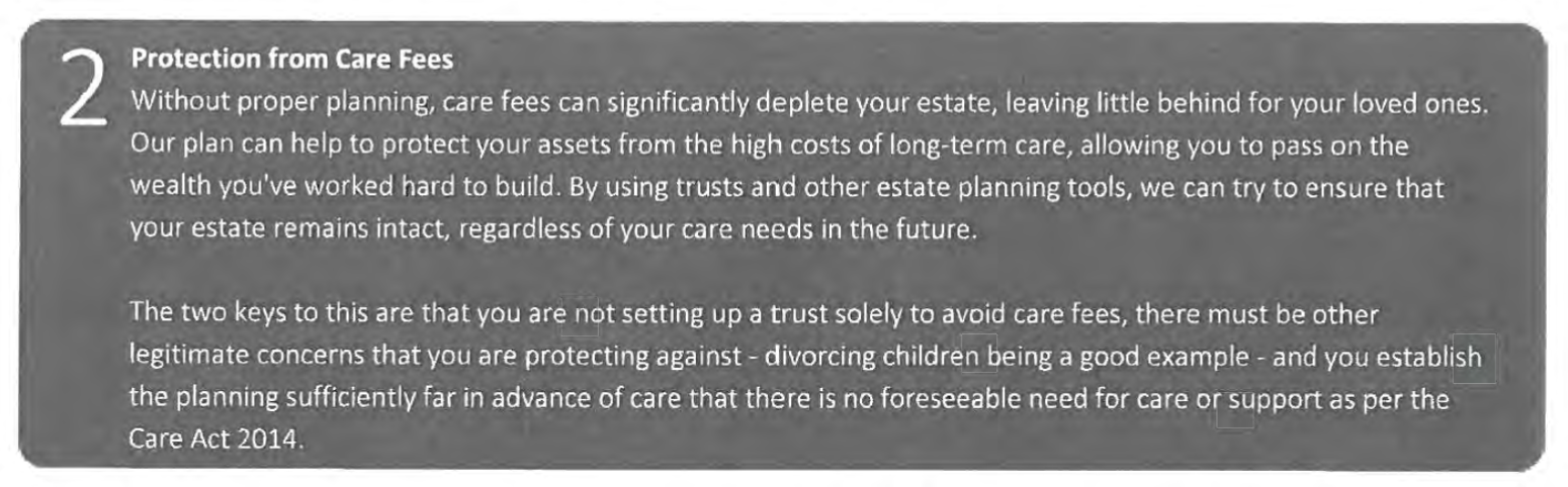 As is often the case with tax planning, this means that MP Estate Planning’s own marketing undermines the effectiveness of their product. Someone who obtains advice from MP Estate Planning and then creates a trust could well be in a worse position than someone who creates a trust themselves, or using some other adviser who doesn’t use care home fees as a selling point. ↩︎