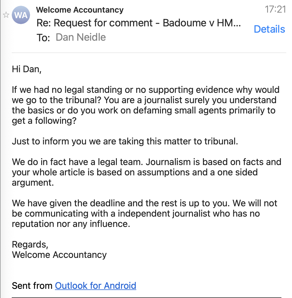 After publication we wrote to Welcome Accountancy again, and said we’d correct any factual or legal errors. They responded – not to identify any errors, but to say that the case is still ongoing (as if they were unaware of the judgment). They said they’d take legal action if we didn’t take down the article within 24 hours, but that’s very hard to take seriously: