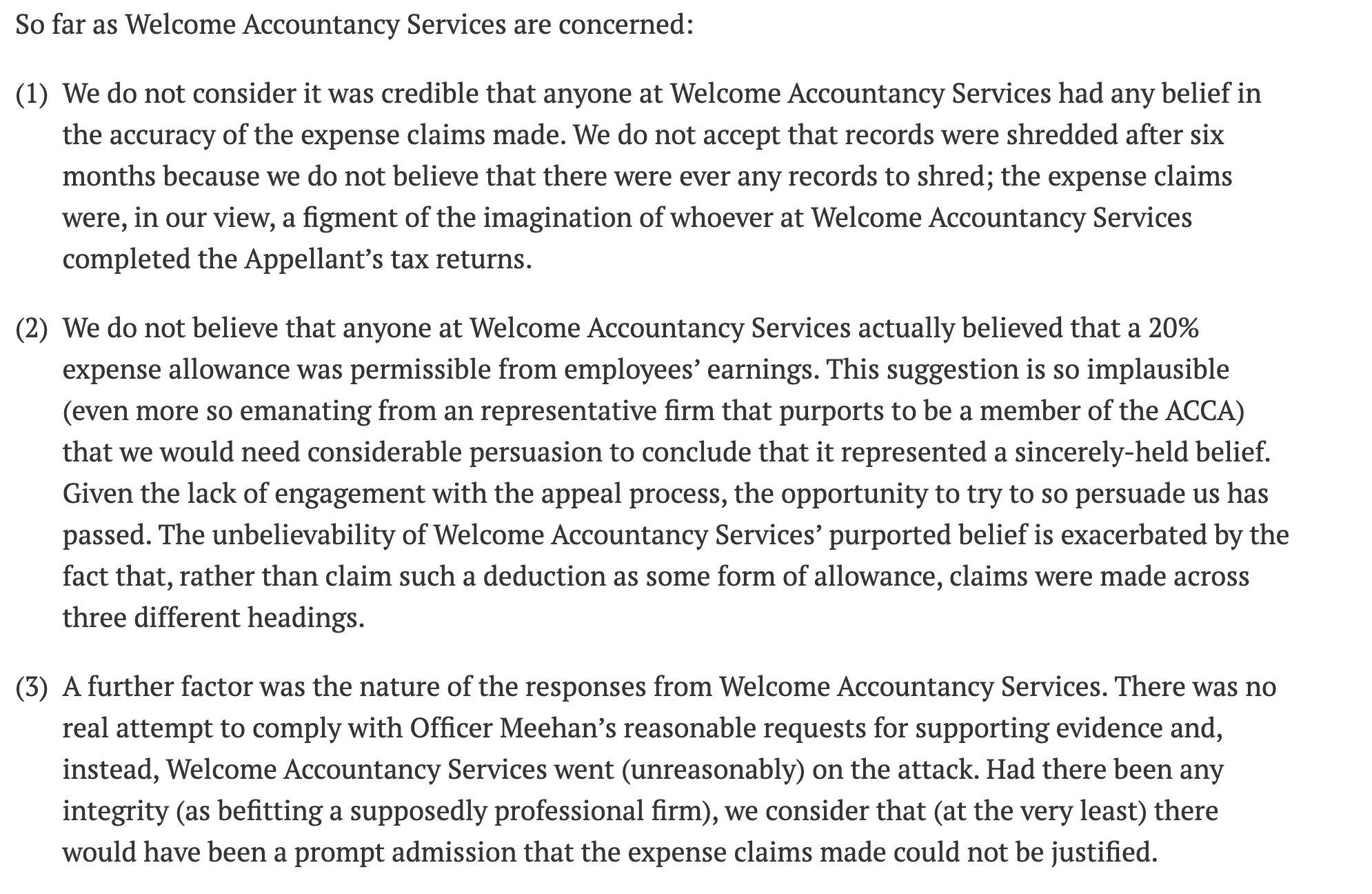 And, as the Tribunal noted, if Welcome Accountancy really believed there was a 20% rule, they would have simply claimed 20%, and not divided the claim between three categories, with fictional stated expenditures. ↩︎