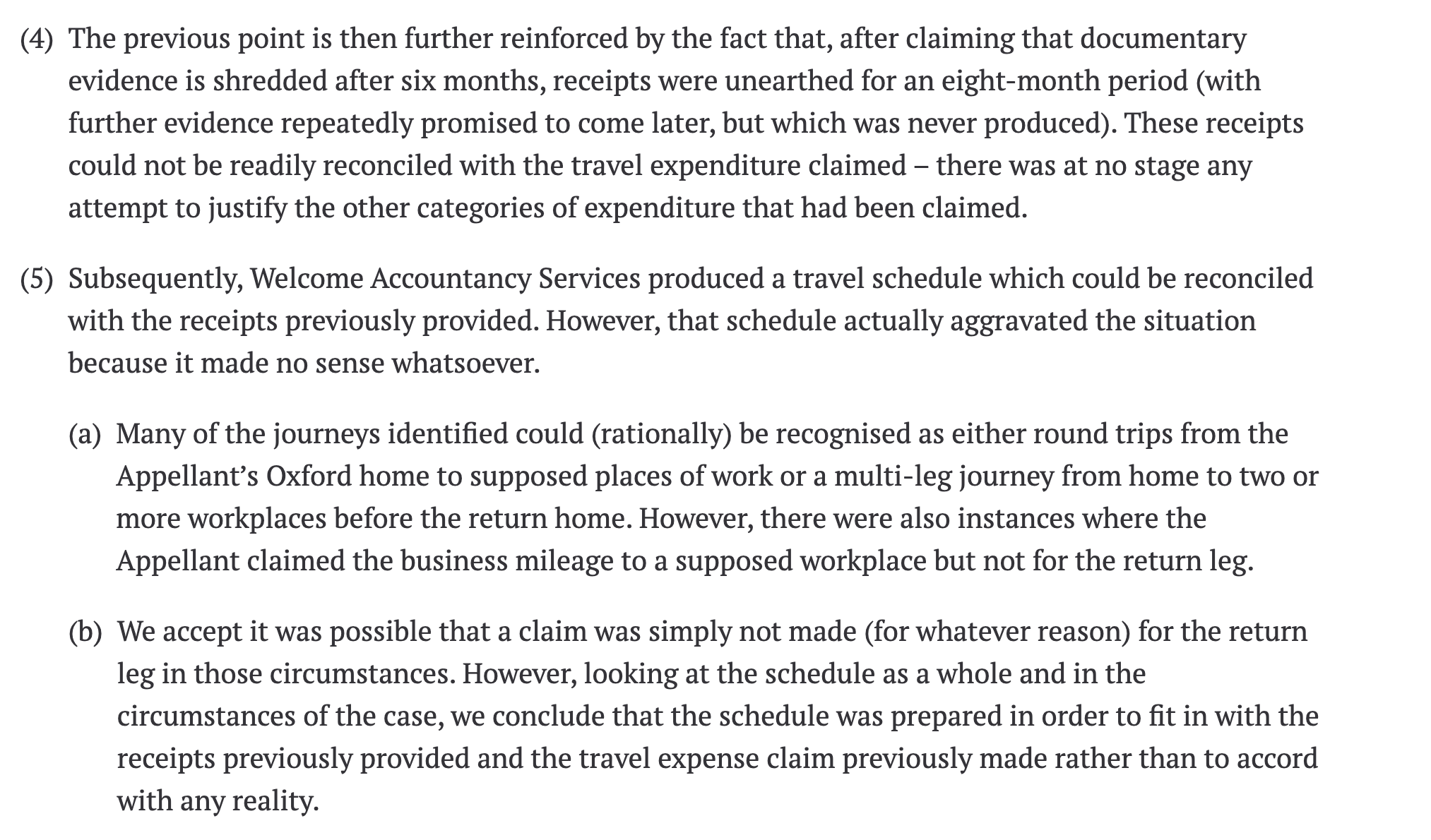 Paragraph 96(5)(b). The Tribunal also noted that many of the claimed journeys were one-way only, with no return leg — inconsistent with any plausible travel pattern. ↩︎