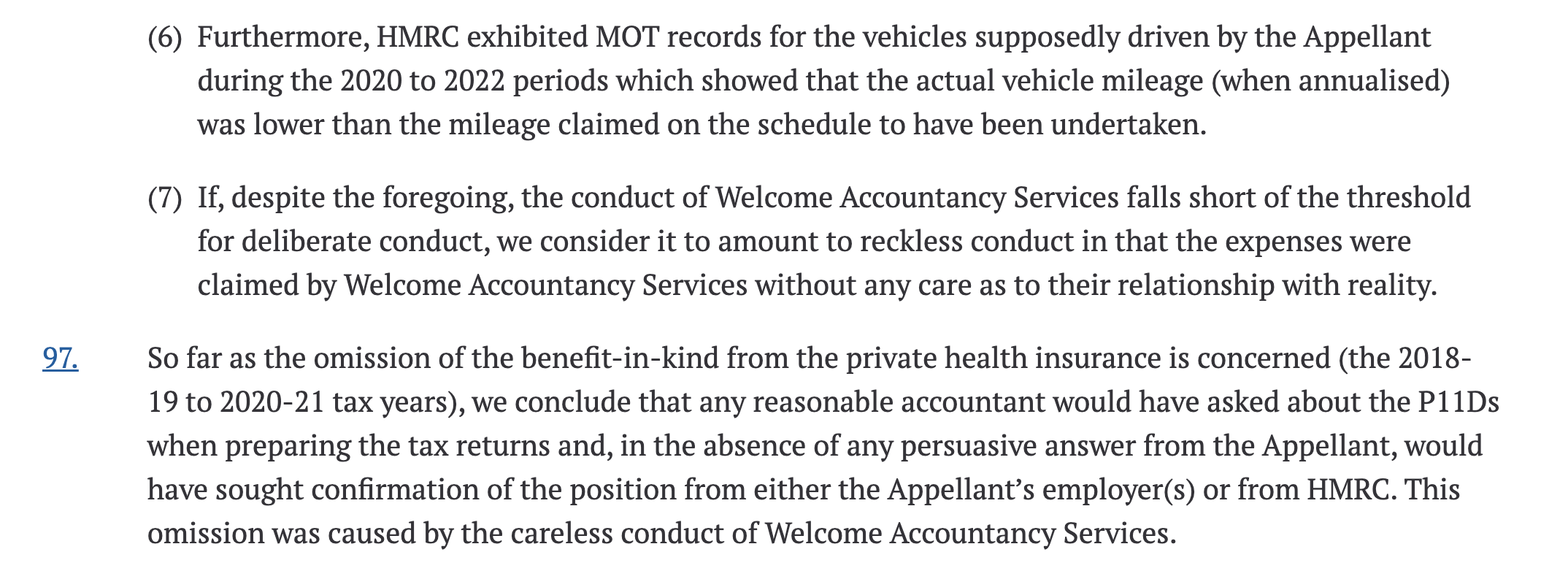 Despite initially claiming the records had been destroyed, Welcome subsequently produced 30 receipts and a travel schedule for part of the 2021-22 year. But HMRC checked the vehicle’s MOT records, and the numbers did not add up: