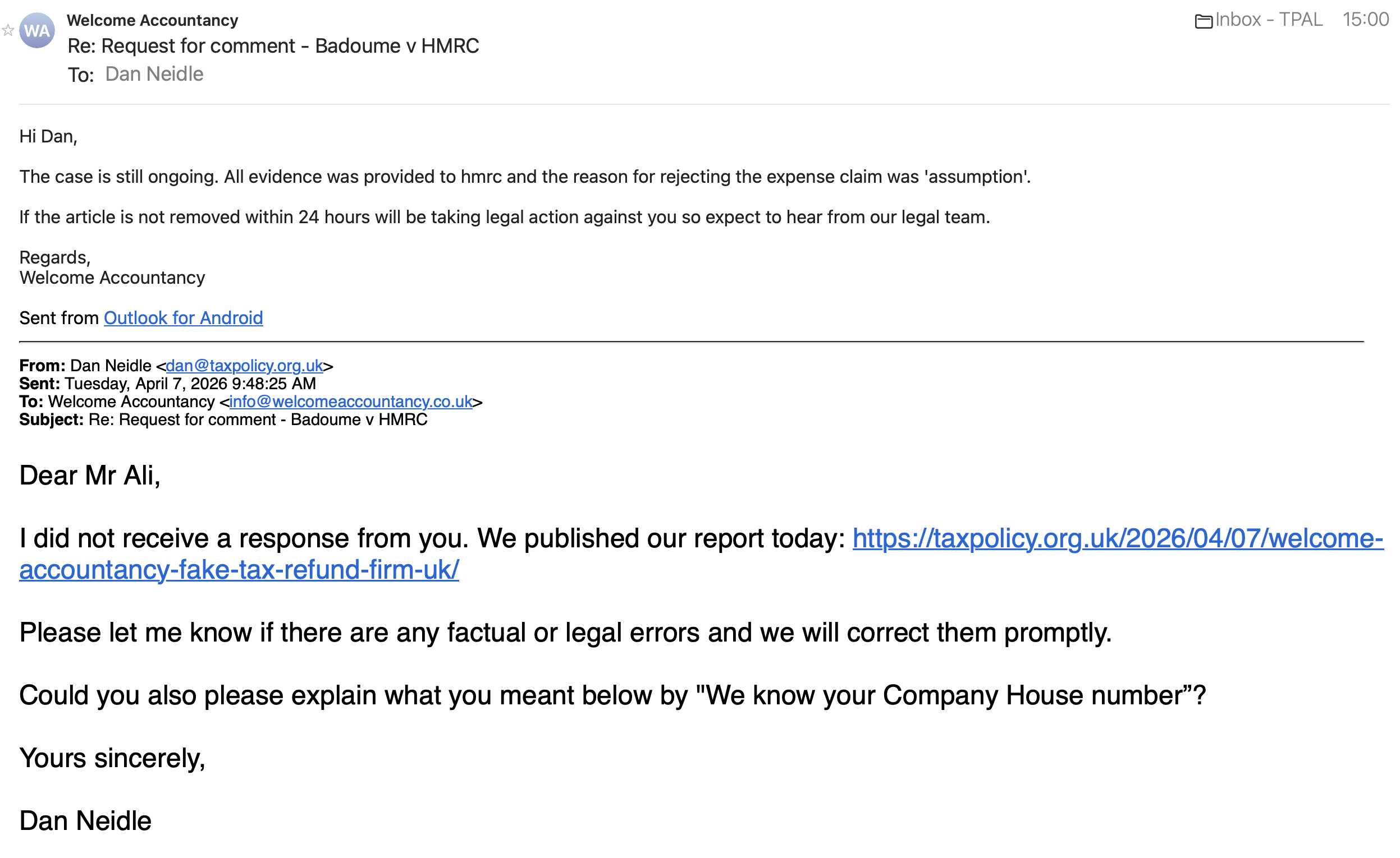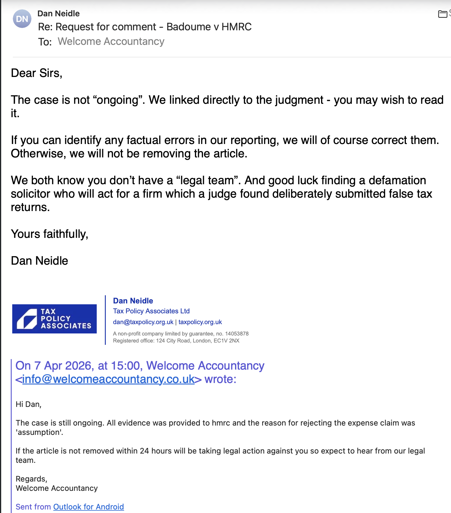After publication we wrote to Welcome Accountancy again, and said we’d correct any factual or legal errors. They responded – not to identify any errors, but to say that the case is still ongoing (as if they were unaware of the judgment). They said they’d take legal action if we didn’t take down the article within 24 hours, but that’s very hard to take seriously: