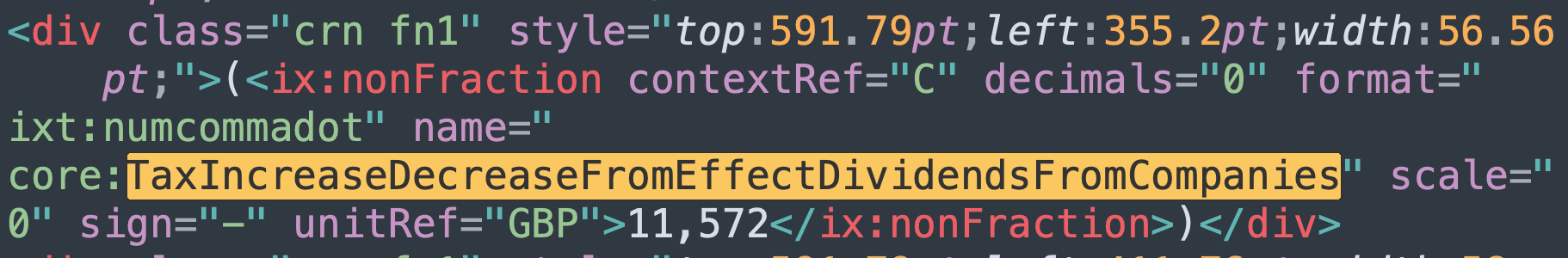 We should, however, consider the possibility that someone was being sloppy and typed “dividend income” when they really meant “dividend income is sheltered by losses”. If all we had was the printed accounts then we couldn’t exclude that possibility. We can, however, go beyond the printed accounts and read the underlying iXBRL code7 that Tisun Three Ltd’s accounting software uploaded to Companies House. The code for this line is: