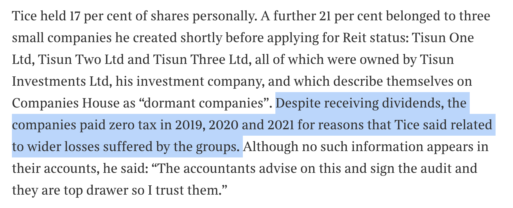 There is then a wider question. If Quidnet failed to withhold tax because it didn’t understand the nature of REIT distributions, and the Tisun companies failed to pay tax on those distributions for the same reason… what other errors were made? In particular, did Mr Tice’s offshore trust pay any tax at all on its distributions? It certainly should have done – but the errors we have found make us wonder if in fact it did.