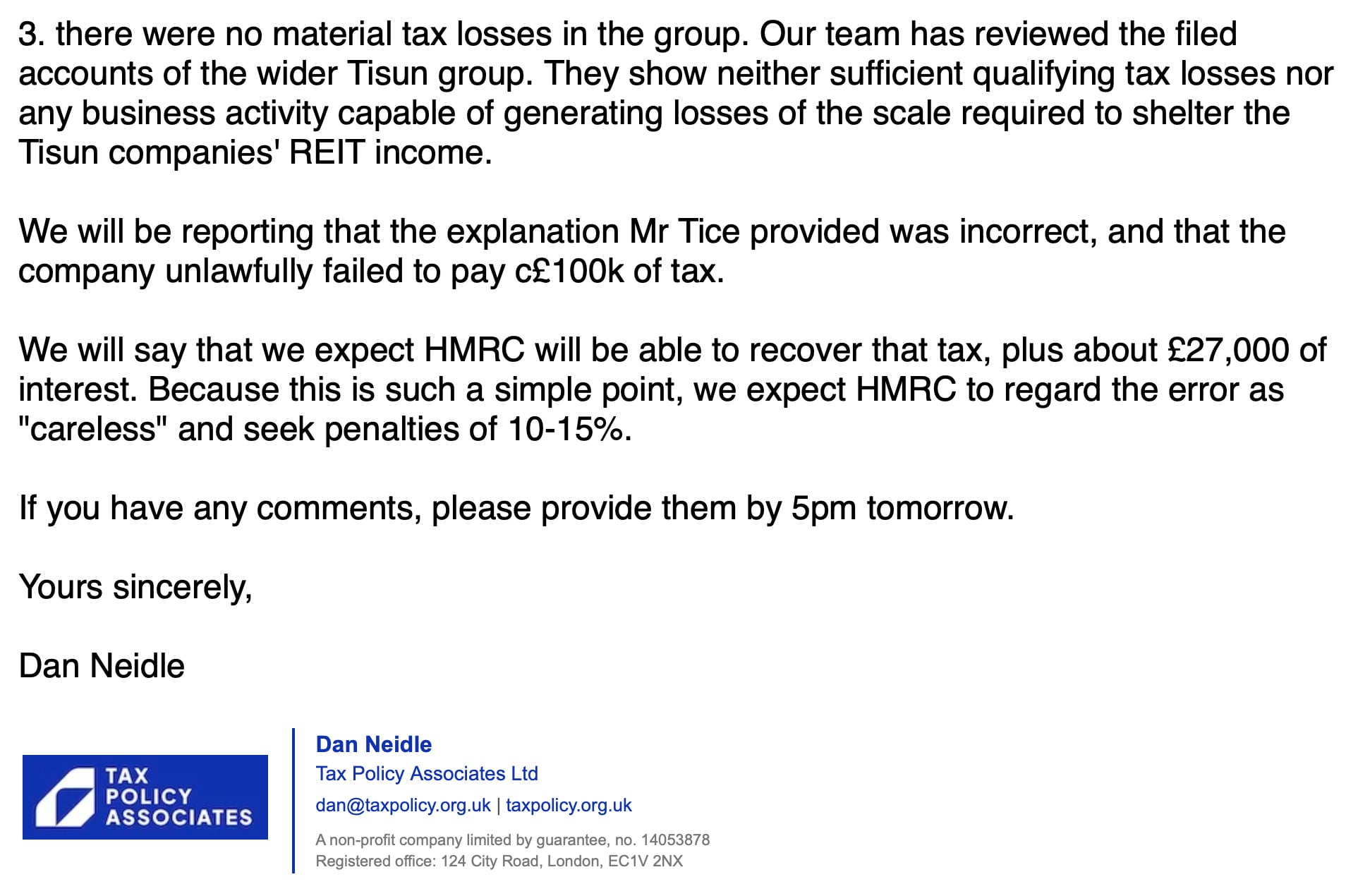 The Sunday Times asked Mr Tice why none of the four Tisun companies ever paid any corporation tax. Mr Tice told The Sunday Times that this was because of “wider losses suffered by the group”: