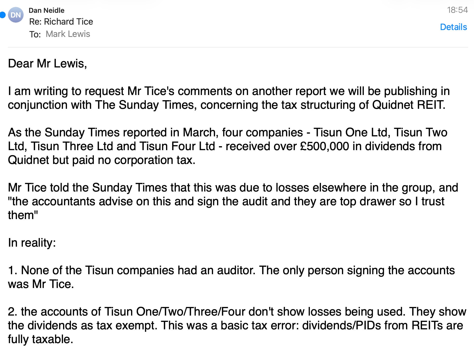 This is a different issue from our previous report, which found that Quidnet REIT failed to withhold about £120,000 of tax on distributions to Mr Tice and his offshore trust. But it arises from the same underlying mistake: claiming the tax benefits of a REIT but ignoring the tax liabilities.